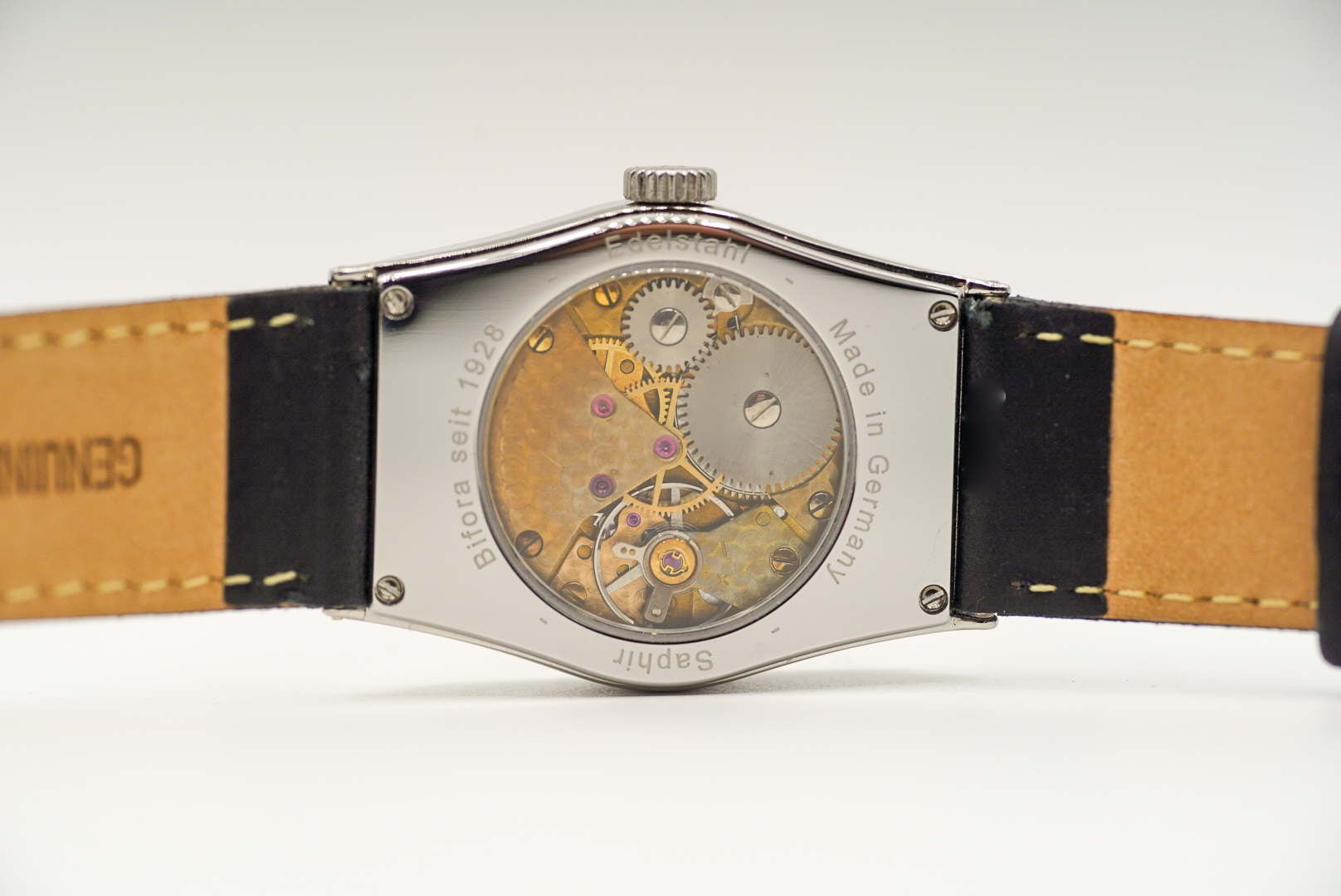 - Werk: Bifora Kaliber 115 NOS (Manufakturwerk, revidiert)
