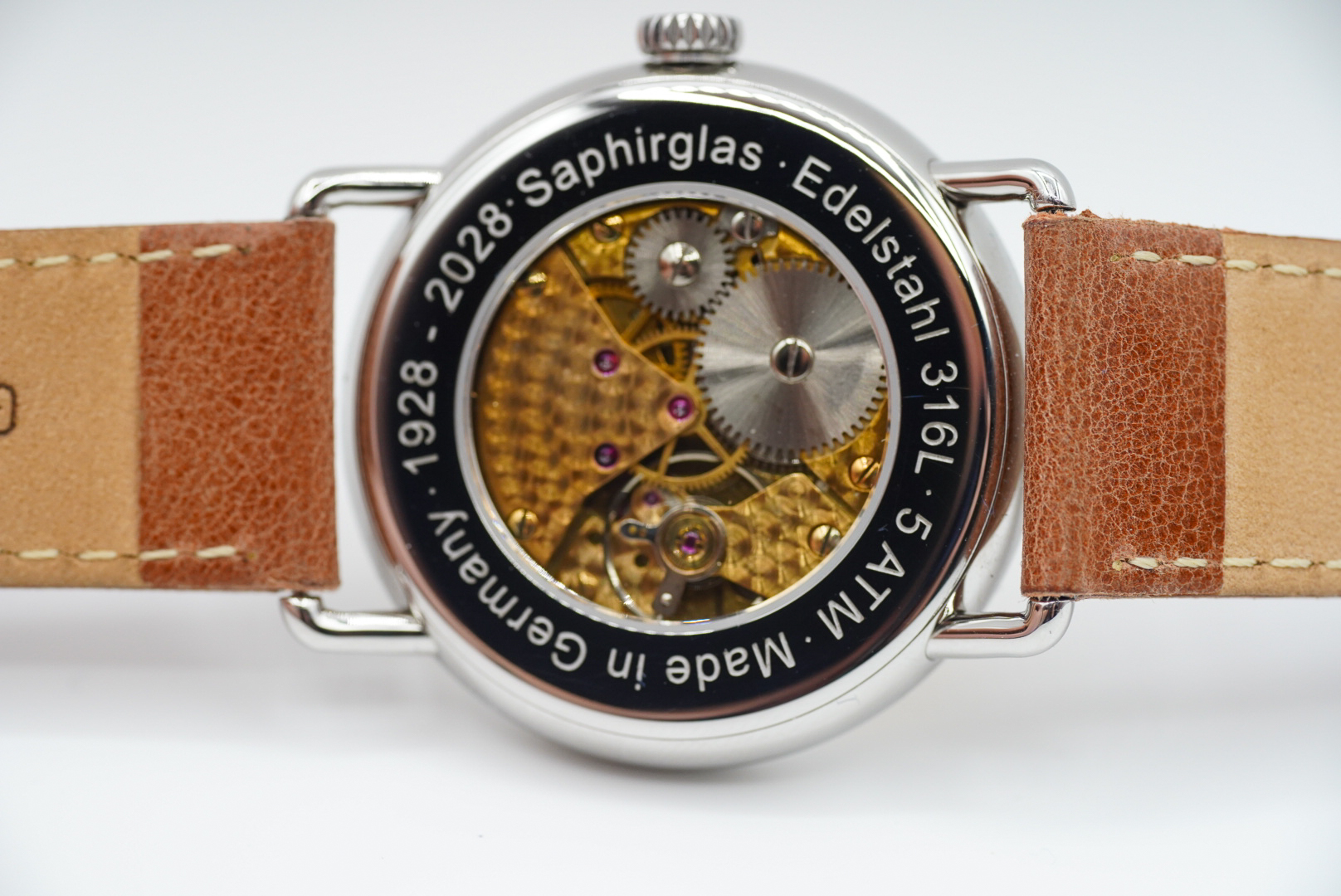 Im Inneren schlägt das zuverlässige Manufaktur Uhrwerk Bifora Kaliber 115 NOS aus den Restbeständen der Gmünder Produktion. Ein echtes Inhouse Manufaktur Uhrwerk, komplett gereinigt und revidiert und somit ein mechanischer Genuss bei jedem Tragen.