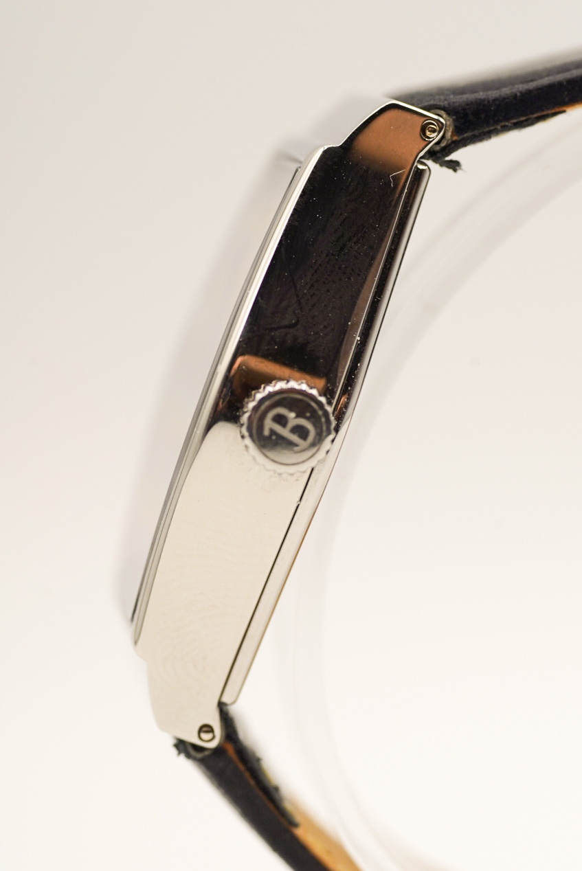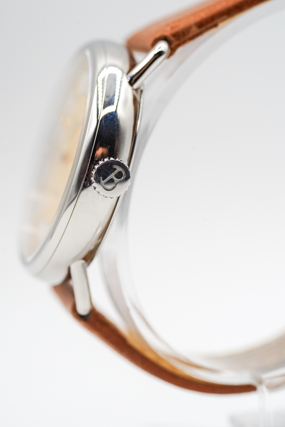 Die Uhr kommt mit einem echt-Lederarmband, gepolstert mit Steppnaht und dem Bifora Logo auf der Schließe.
