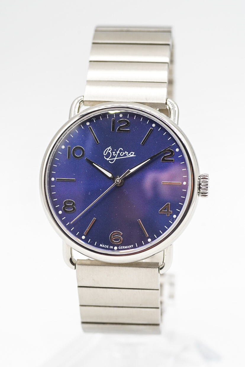 Im Inneren schlägt das zuverlässige Manufaktur Uhrwerk Bifora Kaliber 115 NOS aus den Restbeständen der Gmünder Produktion. Ein echtes Inhouse Manufaktur Uhrwerk, komplett gereinigt und revidiert und somit ein mechanischer Genuss bei jedem Tragen.Das Edelstahlgehäuse misst 39mm und hat beidseits verschraubte Deckel mit Saphirverglasung und ist spritzwassergeschützt bis 5 ATM. Die Uhr kommt mit einem echt-Lederarmband, gepolstert mit Steppnaht und dem Bifora Logi auf der Schließe.