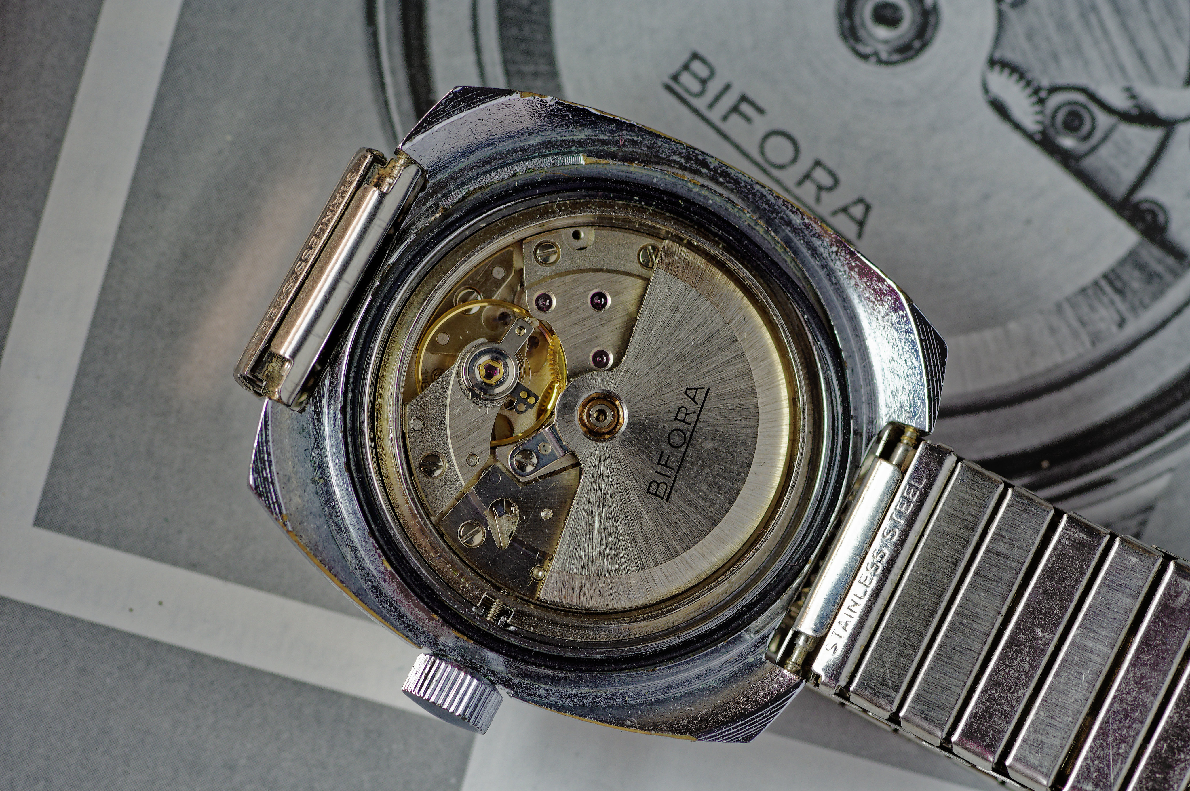 Es ist das Uhrwerk Kaliber 120 aus den Jahren 1955 bis 1968. Dieses Uhrwerk ist die Grundlage für die Bifora „Unima“ und auch den